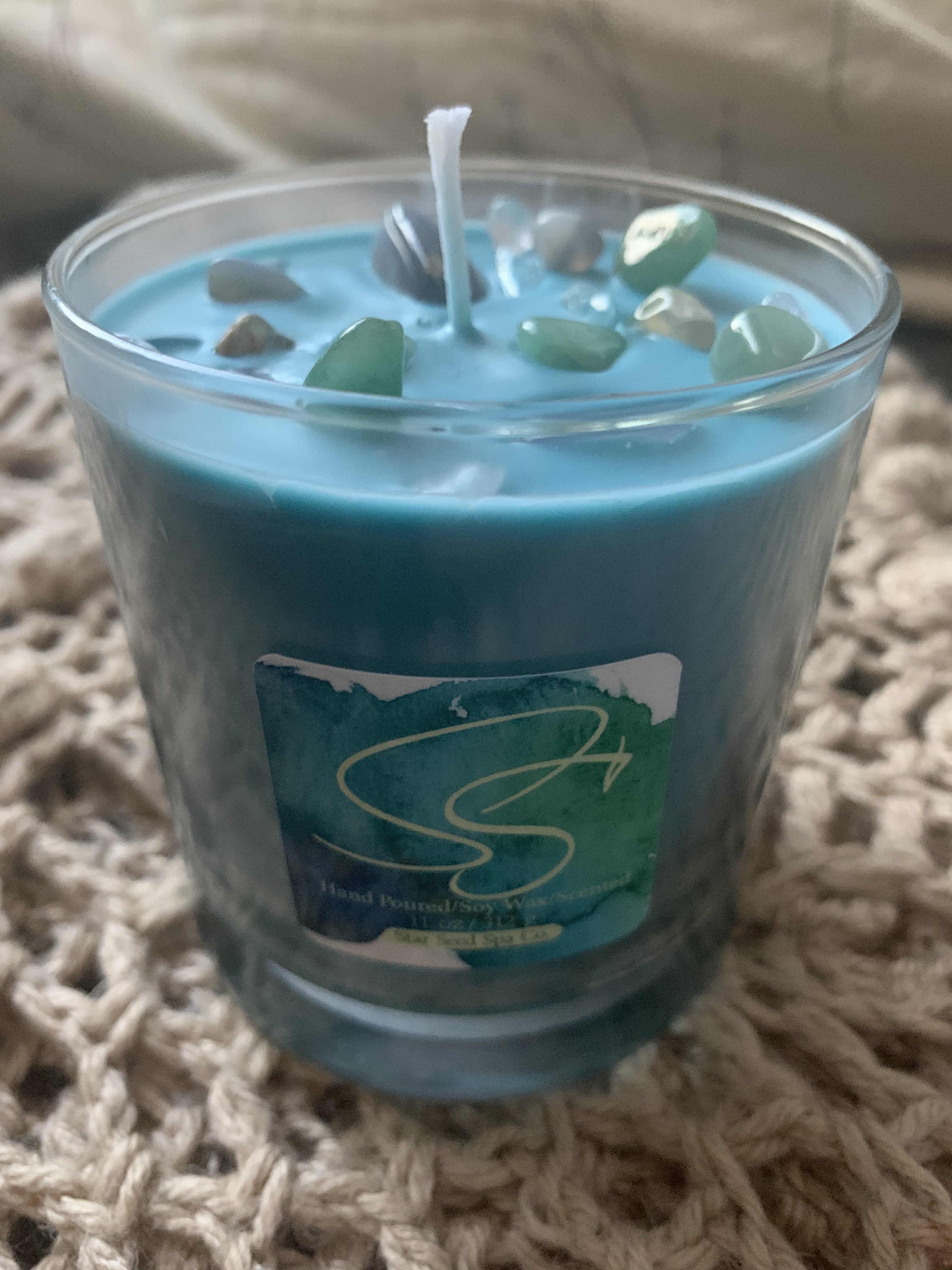 Sapphire Stardust represents our connection to our higher self. A hand poured scented soy wax 11 oz candle with Green Agate, Blue Agate and Clear Quartz crystals. These stones are incredibly powerful stabilizers and help to provide balance and support. Burn this candle to relax, connect with the gentle vibrations of the Cosmos and ground your energies. Extra long 72 hour burn time.