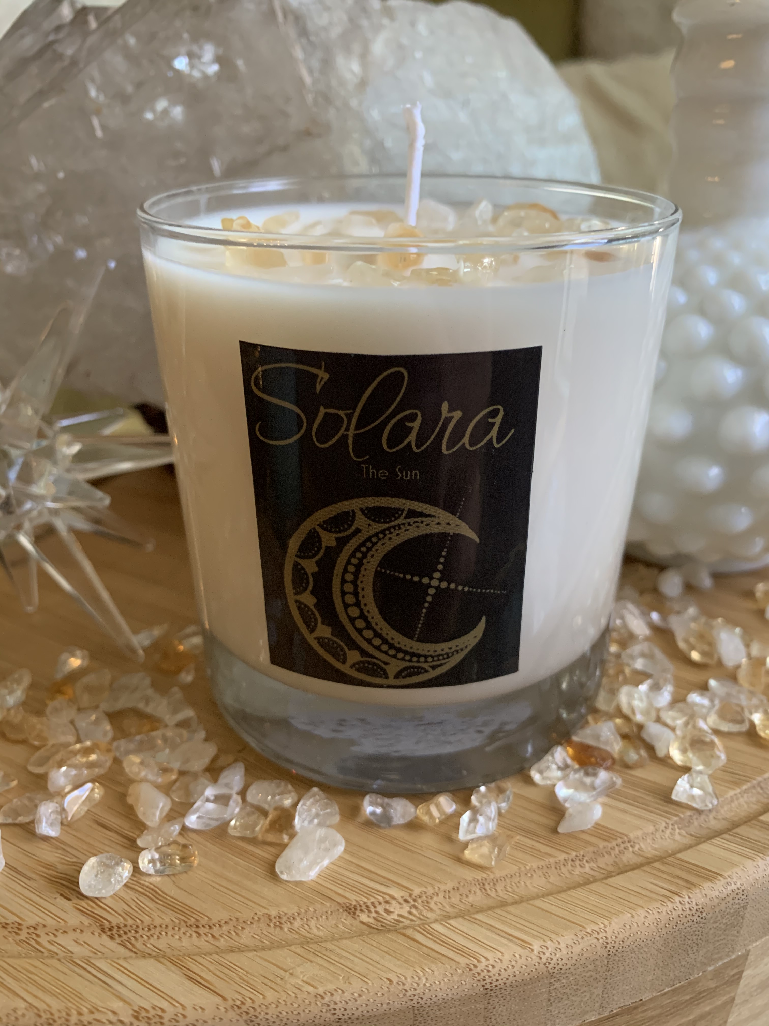 Solara carries the healing energy of the Sun. A hand poured scented soy wax 11 oz candle with raw citrine crystals. It helps to inspire confidence, direction, clear mindedness and energy to pursue your goals and rejuvenate your spirit. Burn this candle to help in areas of self-improvement, optimism and motivation. Extra long 72 hour burn time.