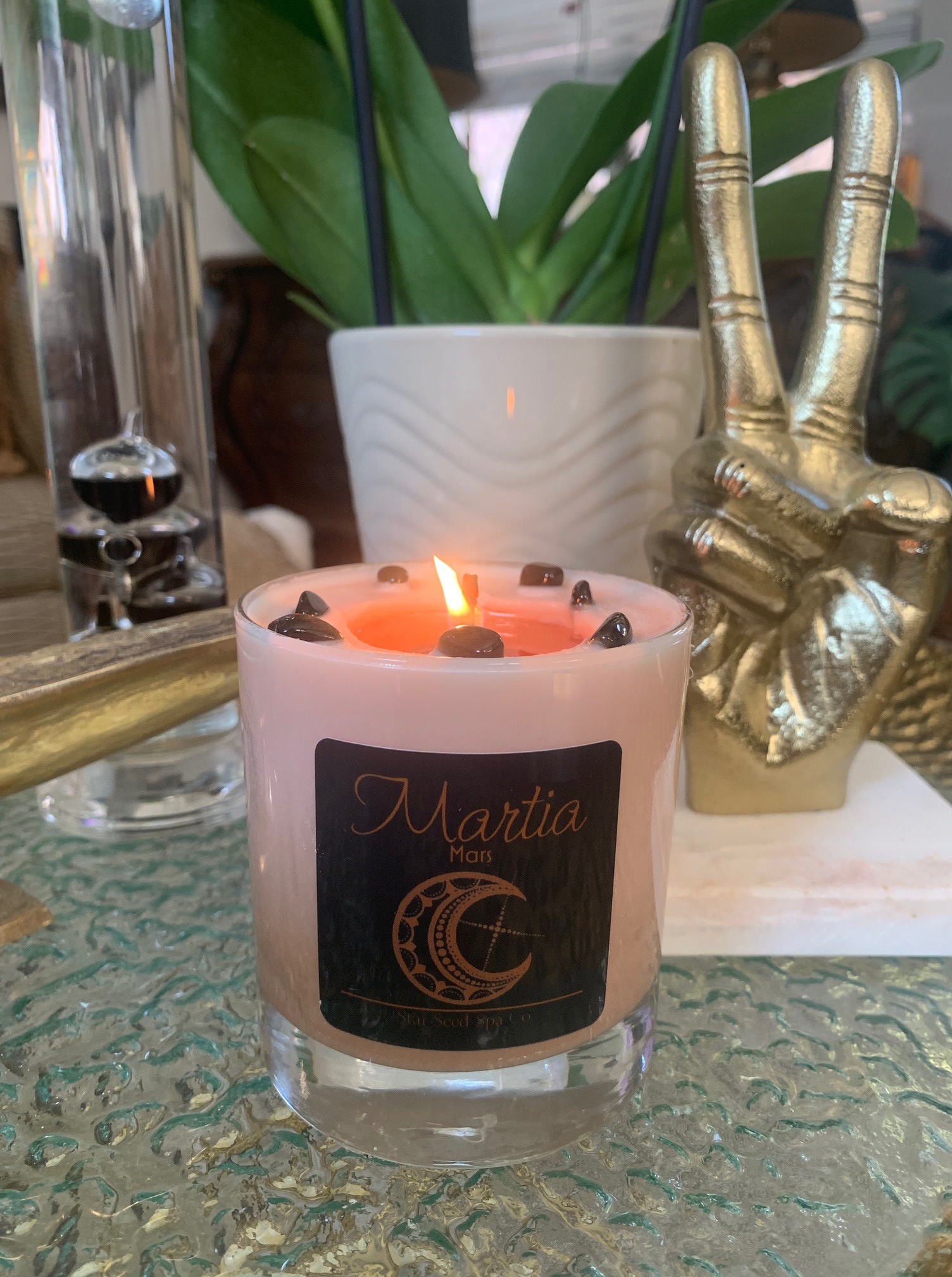 Martia reflects the intense masculine properties of Mars. A hand poured scented 11 oz wax candle with raw obsidian crystals. Use this candle’s reflective energy to connect to your inner strength, powers and passions. Mars offers a mirror to your inner soul, it aligns you to your own security, protection and achievement.